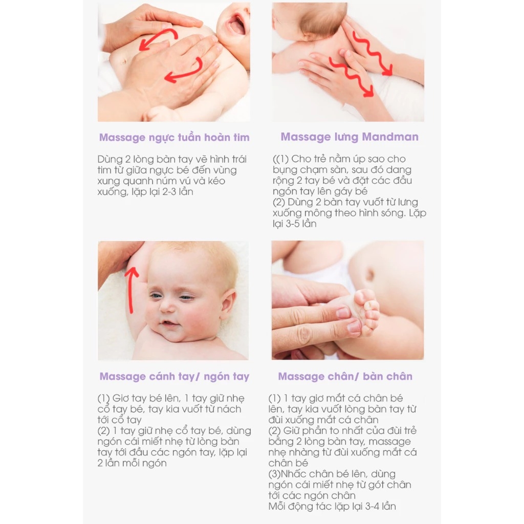 👉 Massage trẻ đúng cách kết hợp với sử dụng dầu massage mang đến nhiều lợi ích như: lưu thông tuần hoàn máu, thúc đẩy phát triển hệ miễn dịch, làm săn chắc cơ thể,… Trên thị trường hiện nay, các loại dầu massage cho bé xuất hiện khá nhiều. Tuy nhiên, trong số đó không phải loại nào cũng an toàn và phù hợp với bé.