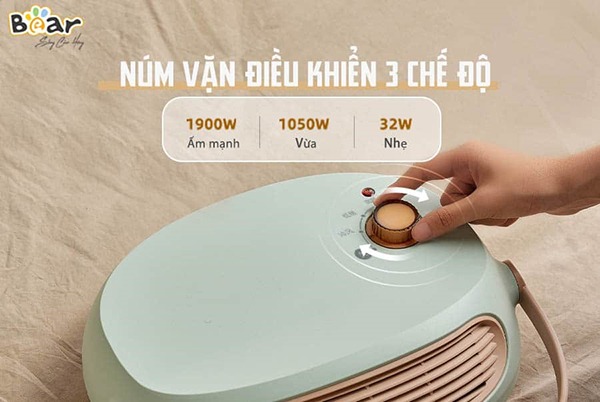 Cách sử dụng máy sưởi Bear DNQ-A19B1 vô cùng đơn giản thông qua thao tác vặn núm xoay từ trái qua phải, điều chỉnh đến mức nhiệt bạn muốn sử dụng. Quạt sưởi Bear có 3 tốc độ gió khác nhau tương ứng với 3 mức công suất, thuận tiện trong việc điều chỉnh theo nhu cầu.