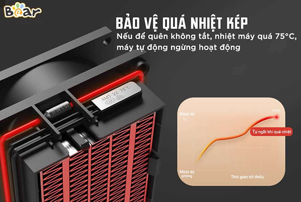 Máy sưởi Bear DNQ-A19B1 còn có một chức năng đặc biệt chính là bảo vệ quá nhiệt kép. Chức năng này sẽ khiến máy tự động ngừng hoạt động khi bạn để quên không tắt với cơ chế tự ngắt khi nhiệt máy lớn hơn 75°C.
