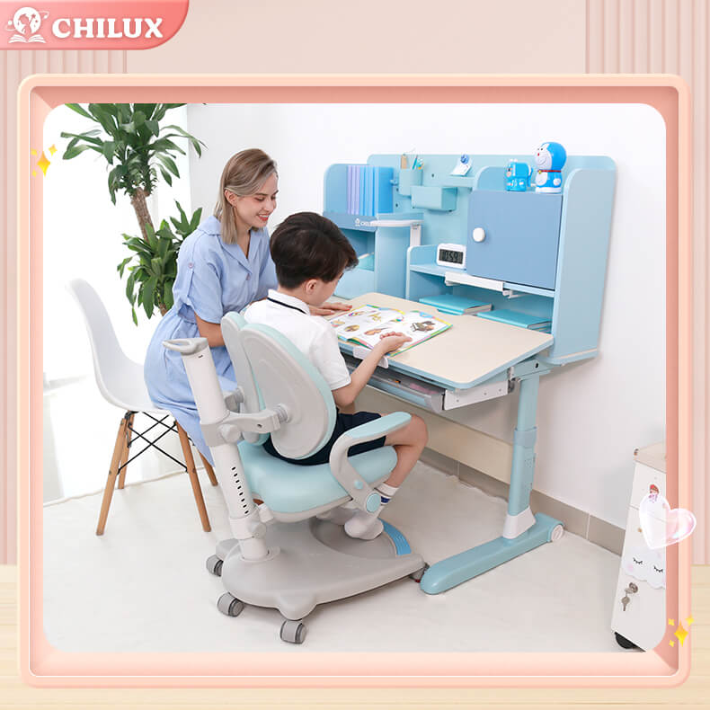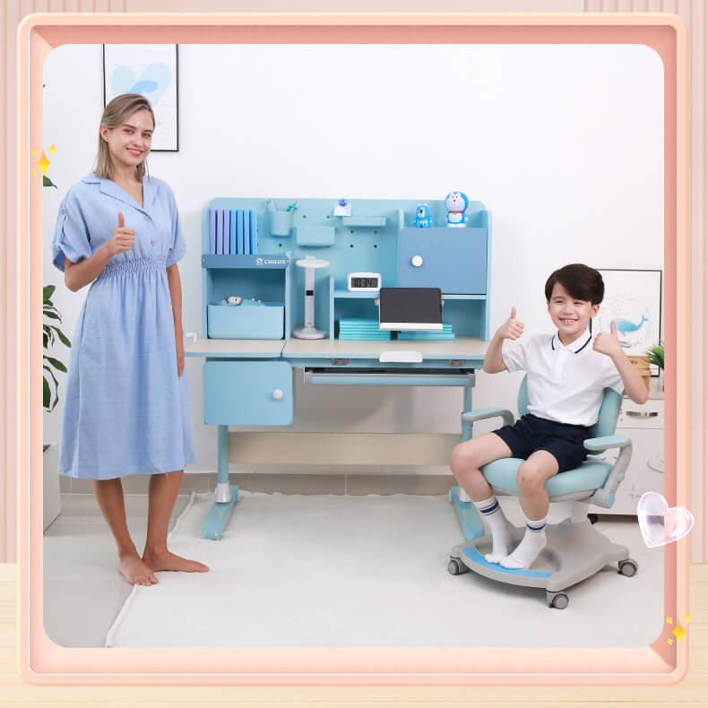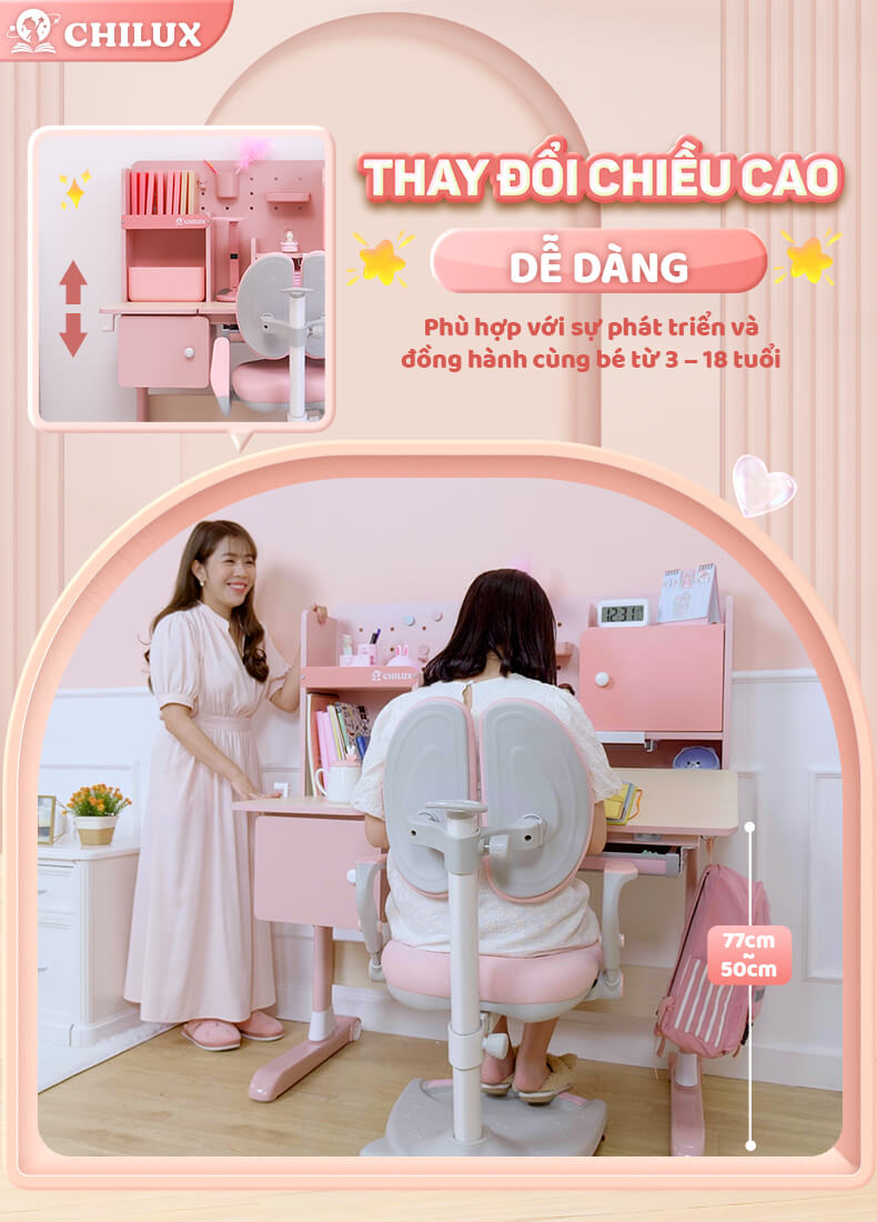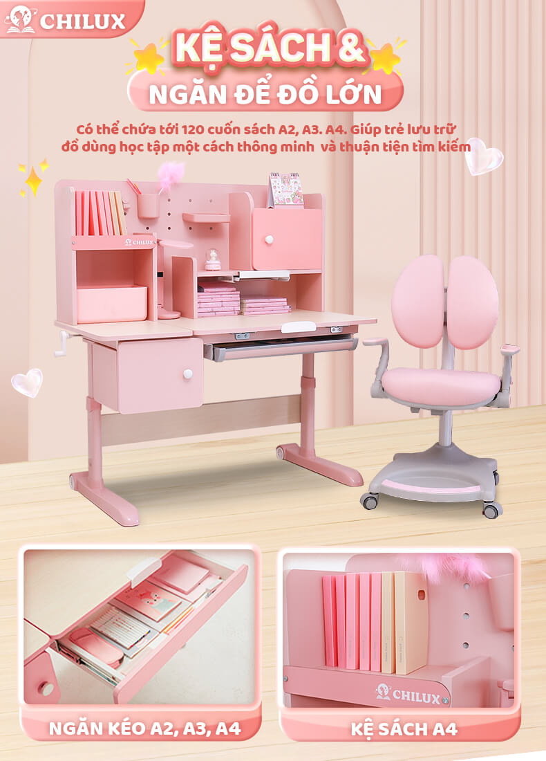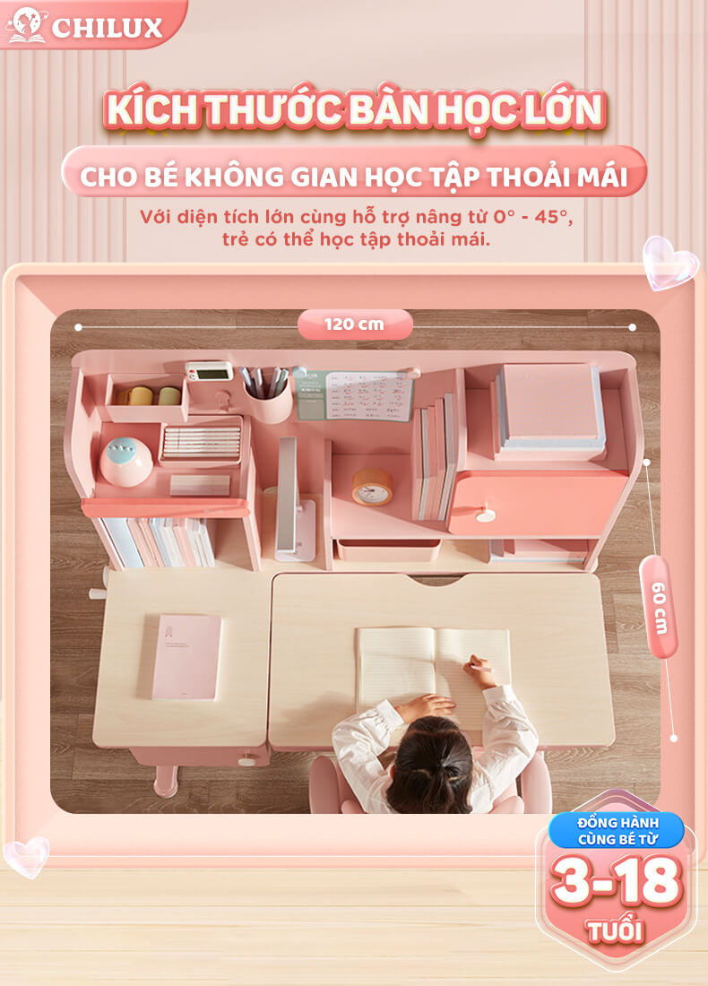 Kích thước bàn học: Mặt bàn kích thước 100 hoặc 120 x 60cm, Chiều cao điều chỉnh linh hoạt từ 55 – 77 cm