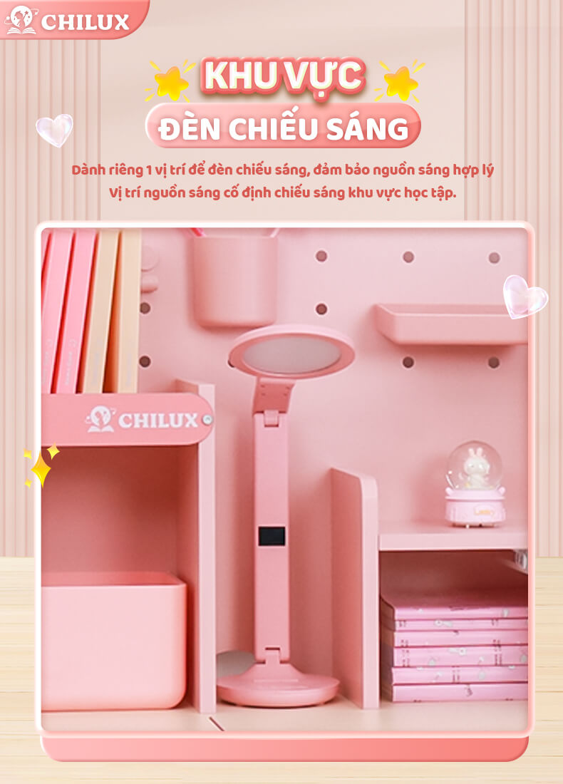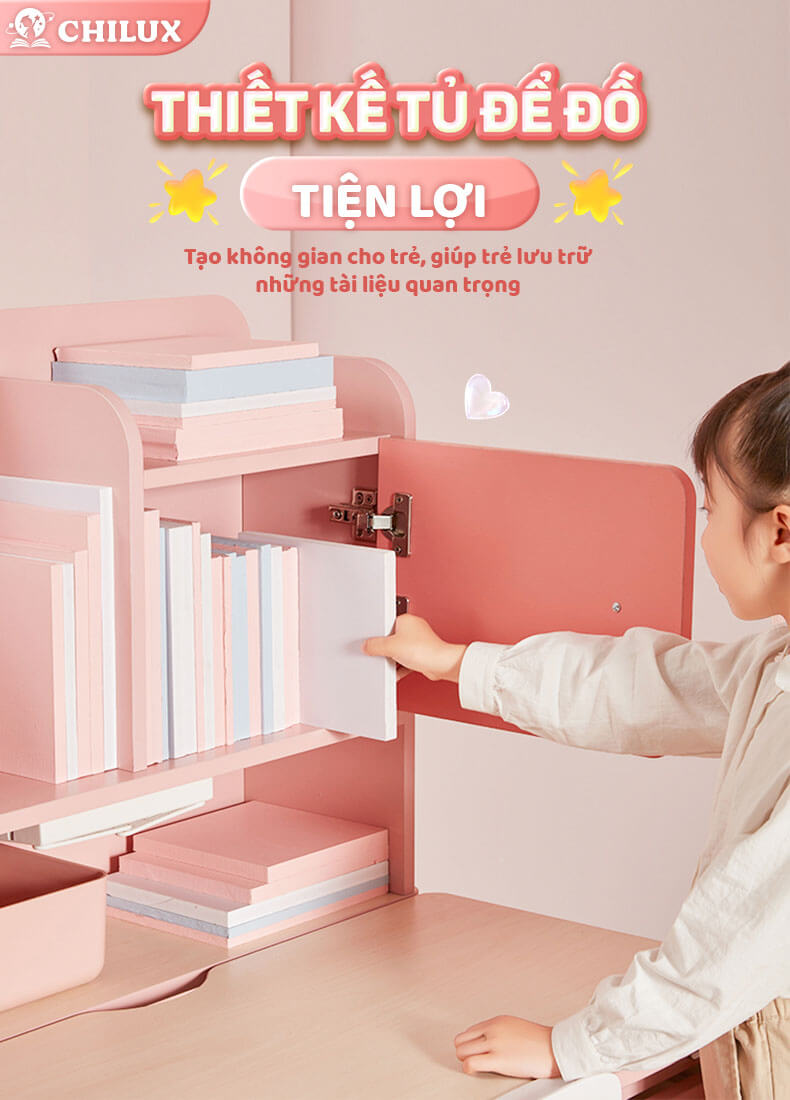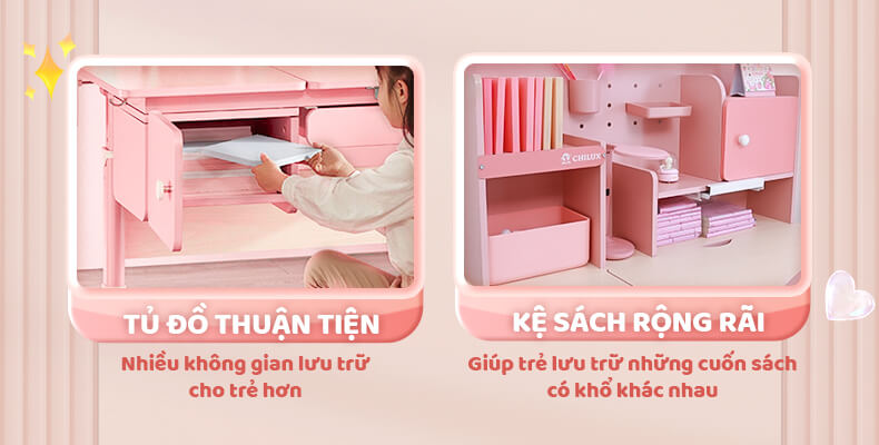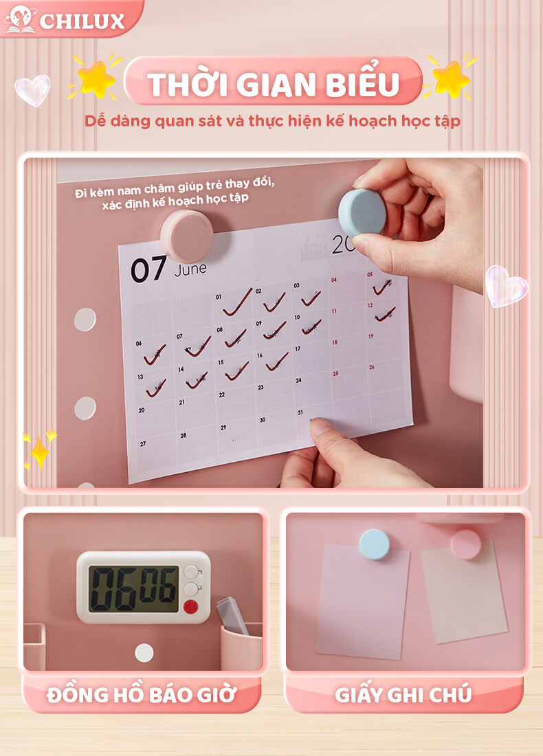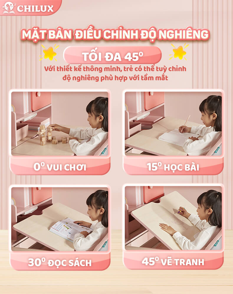 Kích thước bàn học: Mặt bàn kích thước 100 hoặc 120 x 60cm, Chiều cao điều chỉnh linh hoạt từ 55 – 77 cm