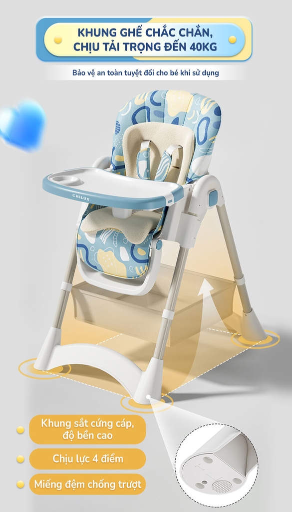 Chịu tải trọng đến 40kg: khung sắt cứng cáp, chịu lực 4 điểm, miếng đệm chống trượt ở chân ghế