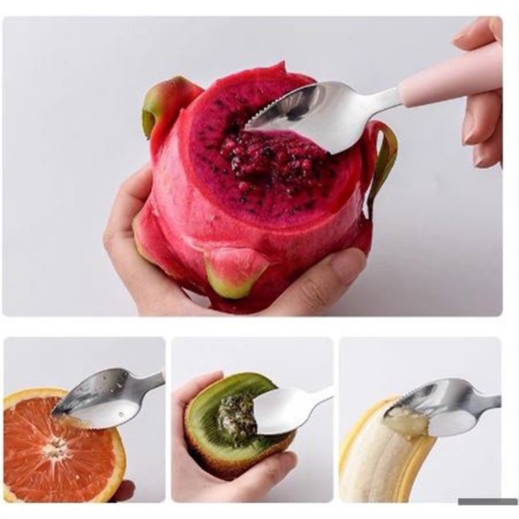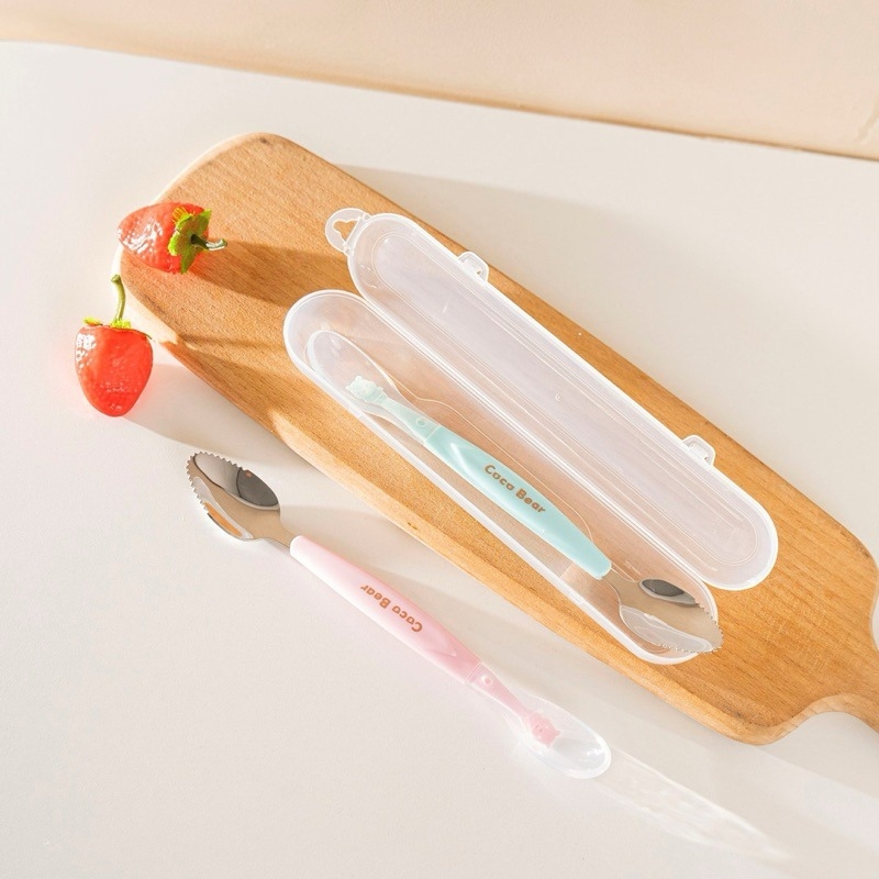 Thìa nạo hoa quả 2 đầu cho bé ăn dặm Coco Bear 1 đầu là inox 304 có các răng cửa nhỏ. chuyên dùng nạo, vét hoa quả 1 cách dễ dàng 1 đầu để xúc cho bé ăn bằng silicon cực mềm.