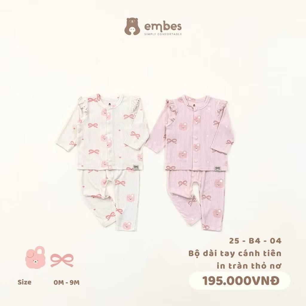 EMBES - Bộ dài tay cánh tiên in tràn thỏ nơ(0-9M)