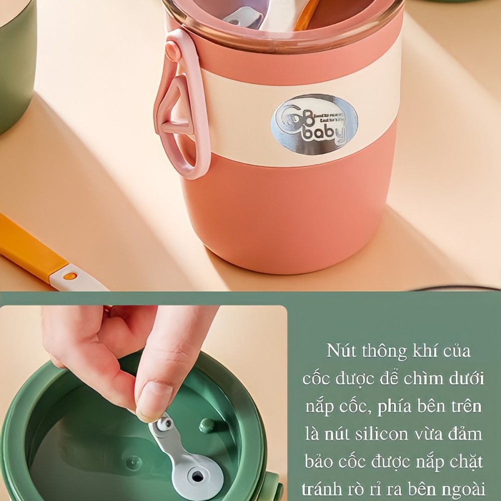 -Nút thông khí của cốc được để chìm dưa nắp cốc, phía bên trên là nút silicon vừa đảm bảo cốc được nắp chặt tránh rò rỉ ra bên ngoài vừa tăng khả năng giữ nóng của cốc, khi mở ra bạn chỉ cẩn nhấc mở lỗ thông khí ra là đã có thể ngửi được mùi hương của món ăn bên trong rồi