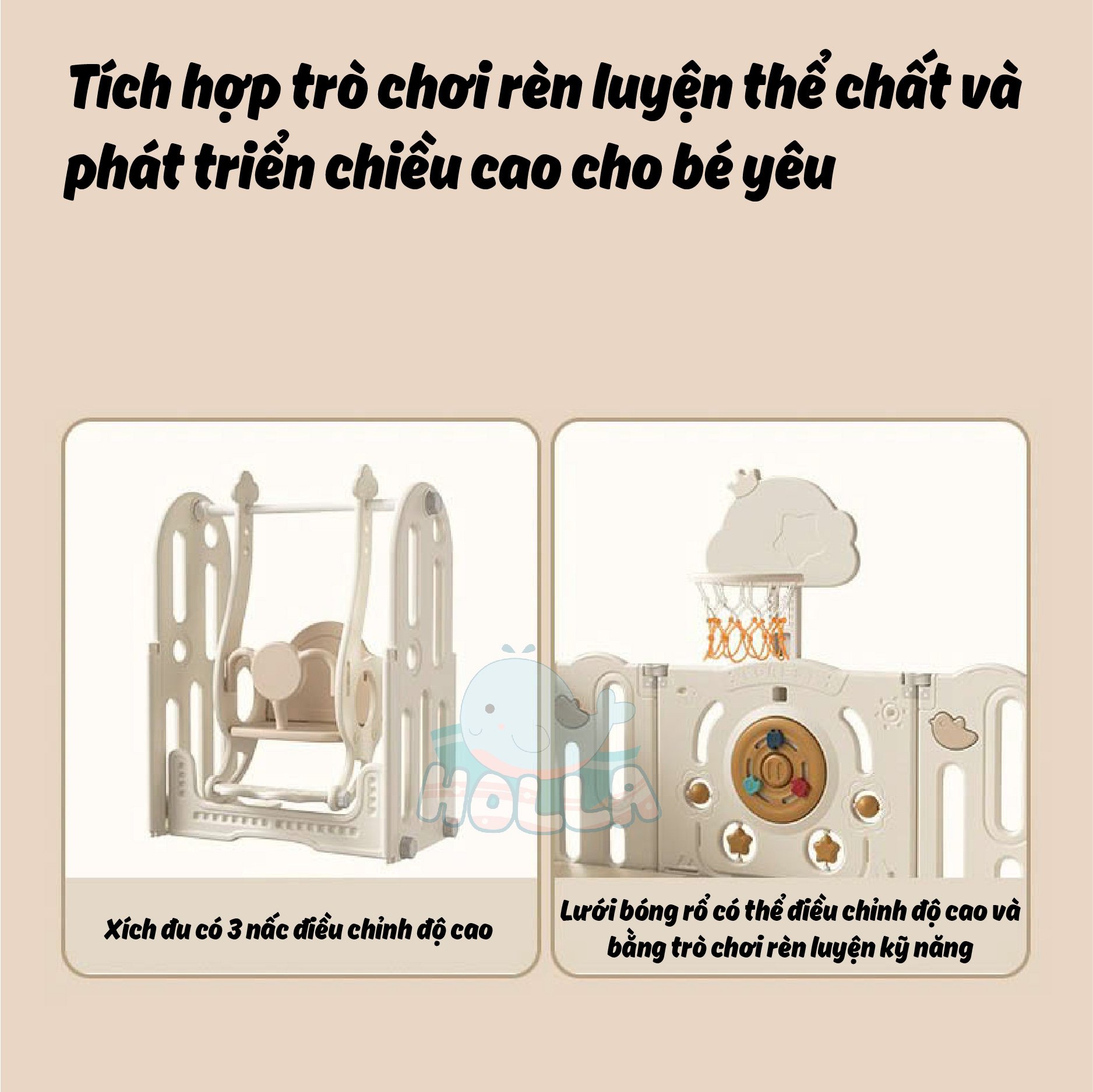 - Bộ cầu trượt xích đu nâng hạ được độ cao, có máng để chân