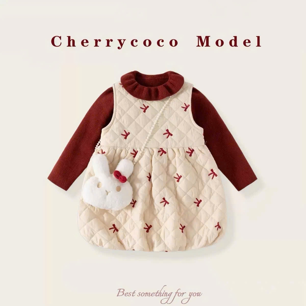 LB - Set áo len đỏ+váy 3 lỗ chần bộng be nơ+túi thỏ(90-140)