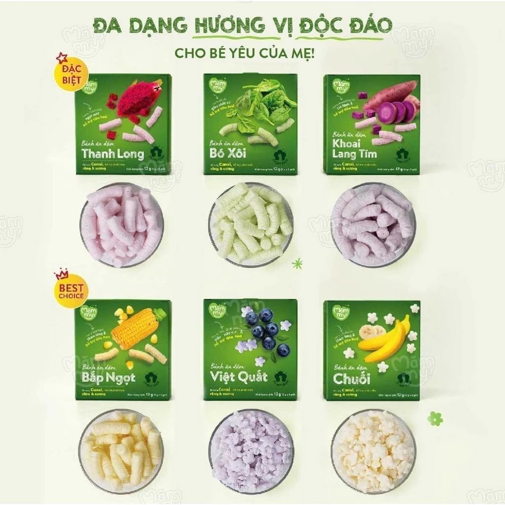 Hương vị tự nhiên, đa dạng: Với các hương vị thơm ngon từ rau củ quả tự nhiên như Thanh Long, Việt Quất, Bó Xôi (rau chân vịt), Chuối, Bắp Ngọt (ngô ngọt), Khoai Lang Tím, bánh ăn dặm Mămmy mang đến sự lựa chọn đa dạng, giúp bé khám phá những hương vị mới lạ và yêu thích bữa ăn dặm hơn.