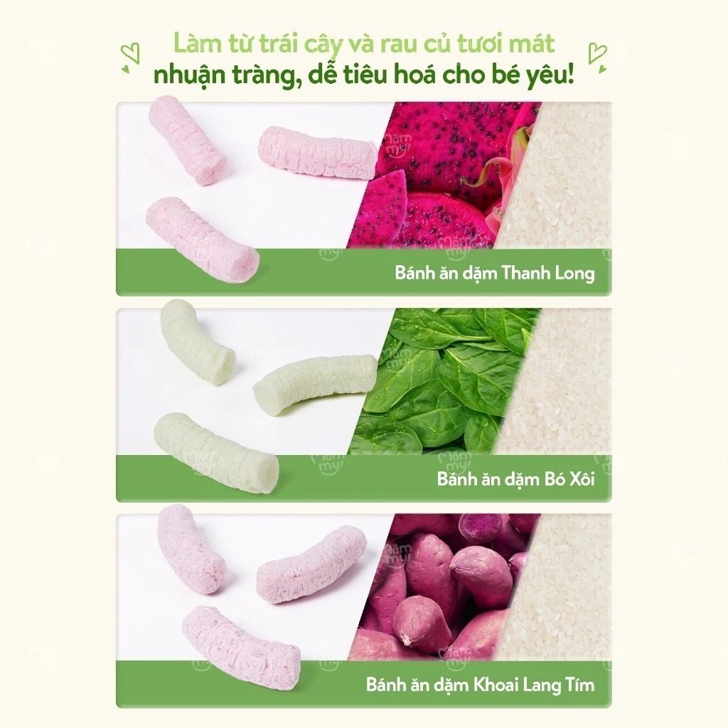 Mămmy Bánh ăn dặm Thanh Long: Hương vị ngọt thanh mát tự nhiên từ quả thanh long giàu vitamin và khoáng chất, không chỉ ngon miệng mà còn tốt cho hệ tiêu hóa của bé.