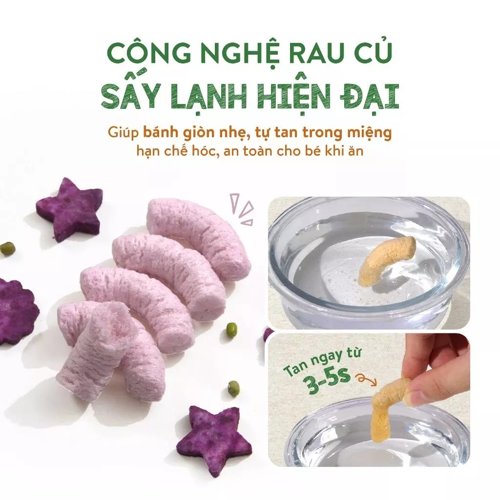 Kết cấu giòn xốp, tan nhanh trong miệng: Công nghệ sấy lạnh hiện đại giúp bánh giòn nhẹ, tan nhanh chóng sau 3-5 giây khi chạm lưỡi, hạn chế nguy cơ hóc nghẹn, an toàn khi bé tự ăn