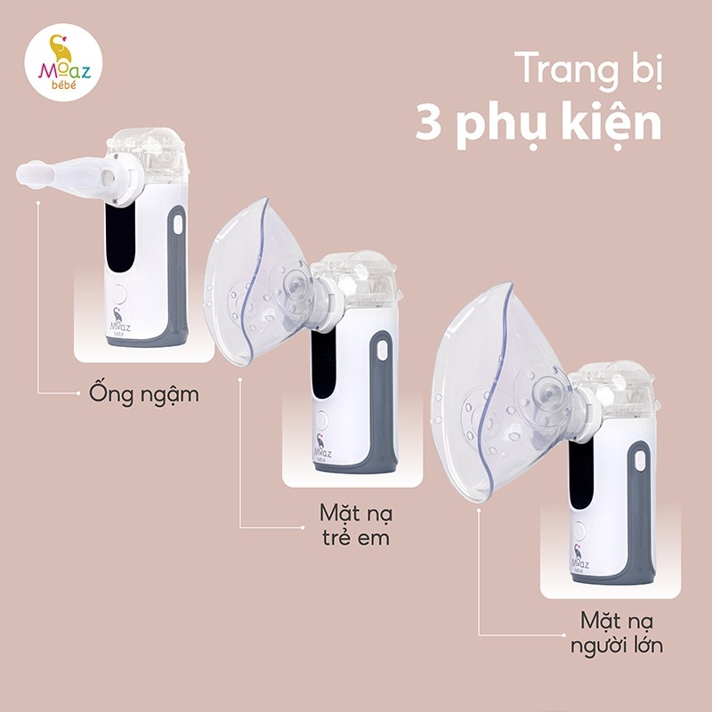 Phụ kiện của máy xông khí dung bao gồm: ống ngậm, mặt nạ người lớn và mặt nạ trẻ em.