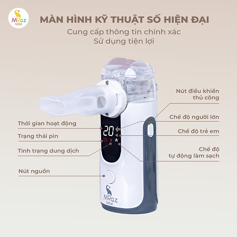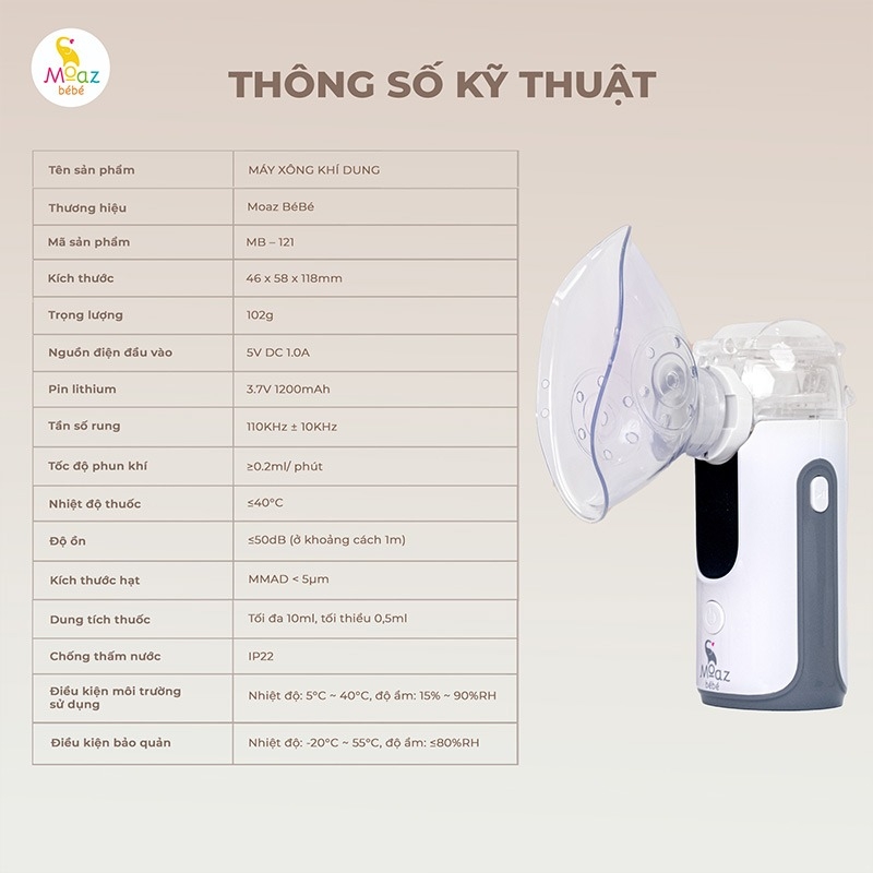 Máy xông khí dung Moaz BéBé MB – 121 là thiết bị hỗ trợ điều trị các bệnh về đường hô hấp và phòng ngừa nhiễm trùng đường hô hấp. Sản phẩm có thiết kế cầm tay nhỏ gọn, thuận tiện để mang theo và dễ dàng sử dụng mọi lúc, mọi nơi. MB – 121 trang bị cả mặt nạ dành riêng cho trẻ em lẫn người lớn, nên sử dụng được cho cả gia đình. Dung lượng pin lớn đến 1200mAH, có thể phun vô số hạt sương siêu mịn với tốc độ cao, dễ dàng đưa vào đường hô hấp và thấm nhanh hơn. Ngoài ra, MB 121 vận hành với độ ồn thấp, không làm bé sợ hãi khi phun.