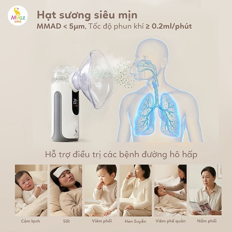 Sử dụng theo đúng loại thuốc, liều lượng và tần suất mà bác sĩ kê sẽ có tác dụng tiêu viêm, dễ thở, giảm các triệu chứng bệnh. Sản phẩm rất thích hợp để dùng trong hỗ trợ điều trị cảm lạnh, sốt, viêm phế quản, hen suyễn, viêm phổi, nấm phổi … Ngoài ra, máy còn có thể sử dụng trong điều trị các bệnh nghề nghiệp, chăm sóc thanh quản, và các bệnh tai – mũi – họng (ENT) như viêm mũi dị ứng mạn tính, viêm thanh quản cấp, viêm họng cấp, viêm amidan cấp…