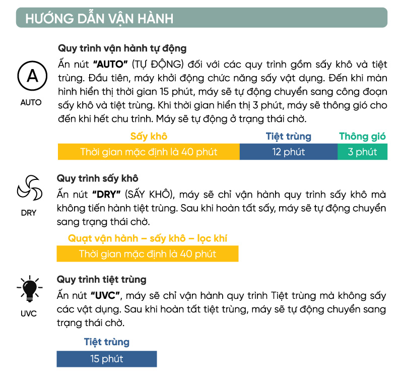 Lưu ý: Tuyệt đối không đưa thực phẩm, đồ dùng chứa pin và các đồ dùng chịu nhiệt dưới 60 độ vào trong thiết bị để sấy khô và tiệt trùng.