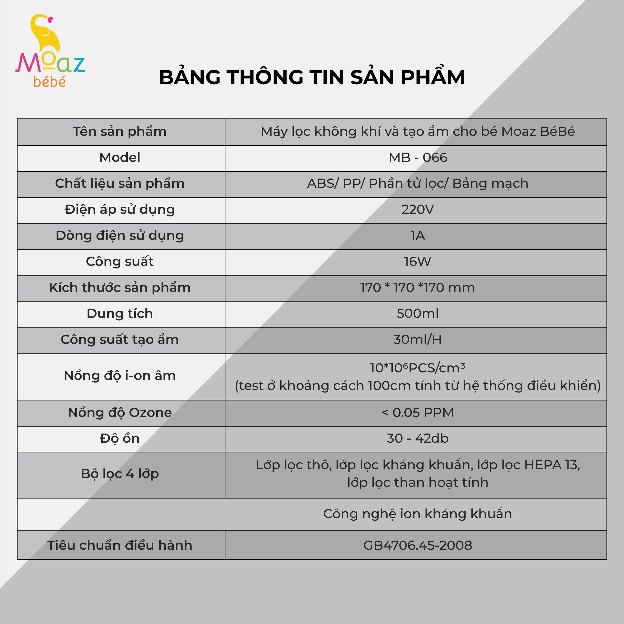 Thông số kỹ thuật máy lọc không khí và tạo ẩm Moaz BéBé
