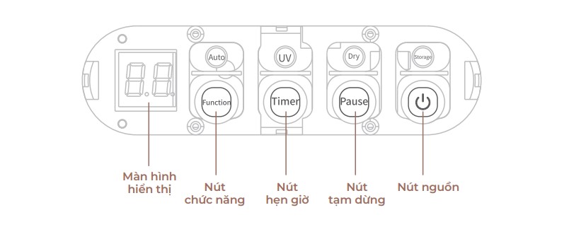 Nút chức năng: Chọn các chức năng tương ứng từ trái sang phải: tự động, tiệt trùng, sấy khô, bảo quản.