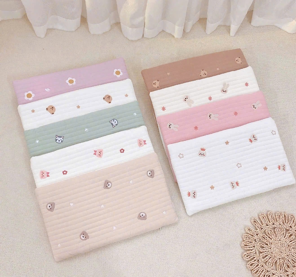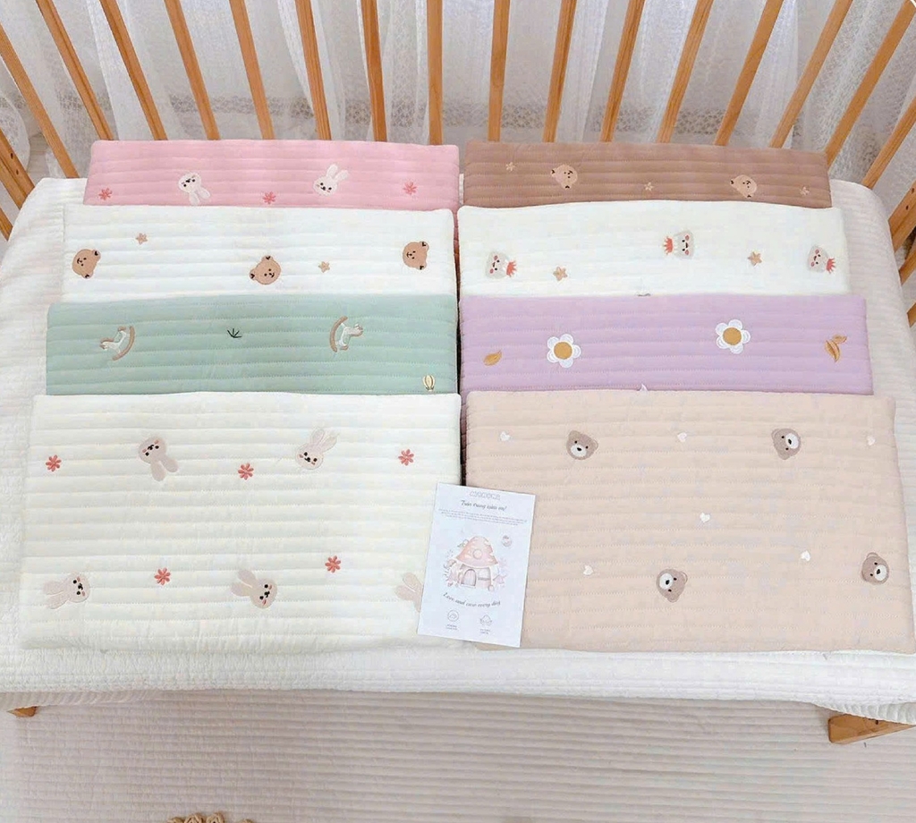 Vỏ gối được làm 100% bằng vải cotton Hàn trần bông, có rãnh thoáng & bông siêu thấm hút. 100% bông đã dc kháng khuẩn an toàn cho da của bé Vỏ gối có thể tháo rời để vệ sinh