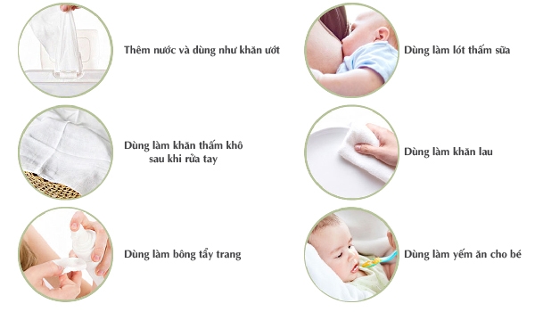 Đa năng: Khăn ướt, khăn lau vệ sinh, khăn lau khô sau khi rửa tay, khăn lau đồ gia dụng, yếm ăn cho bé, lót thấm sữa.