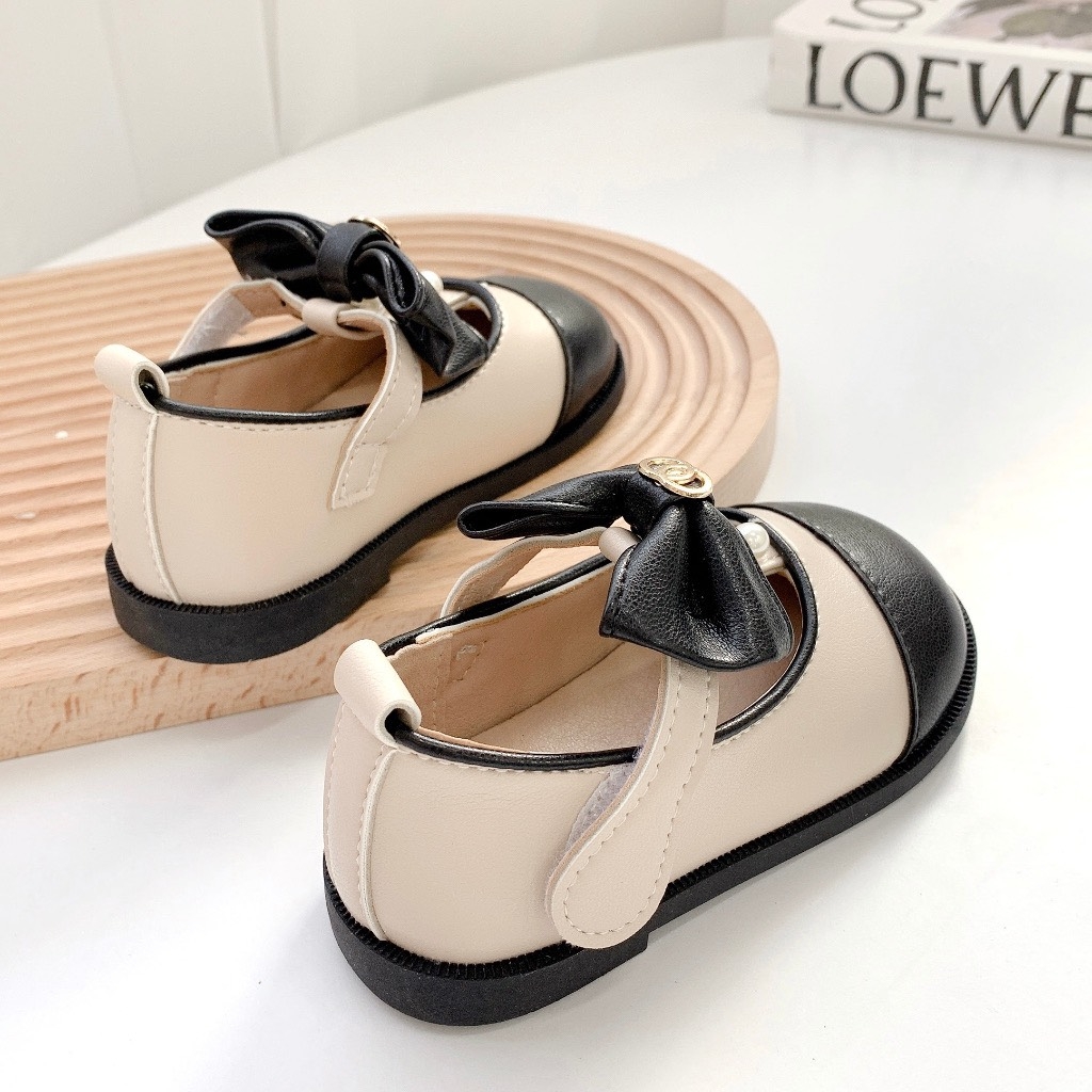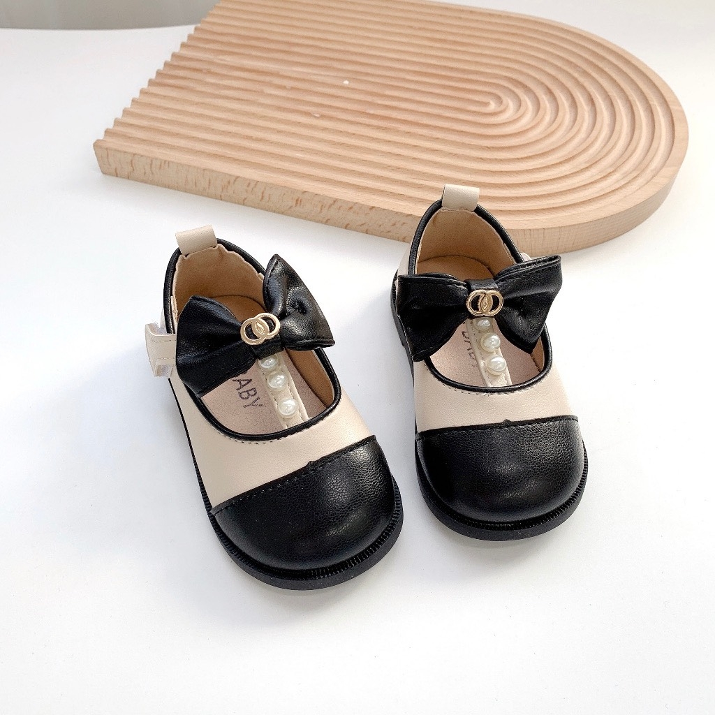 MT Giày búp bê mũi đen phối nơ đính ngọc