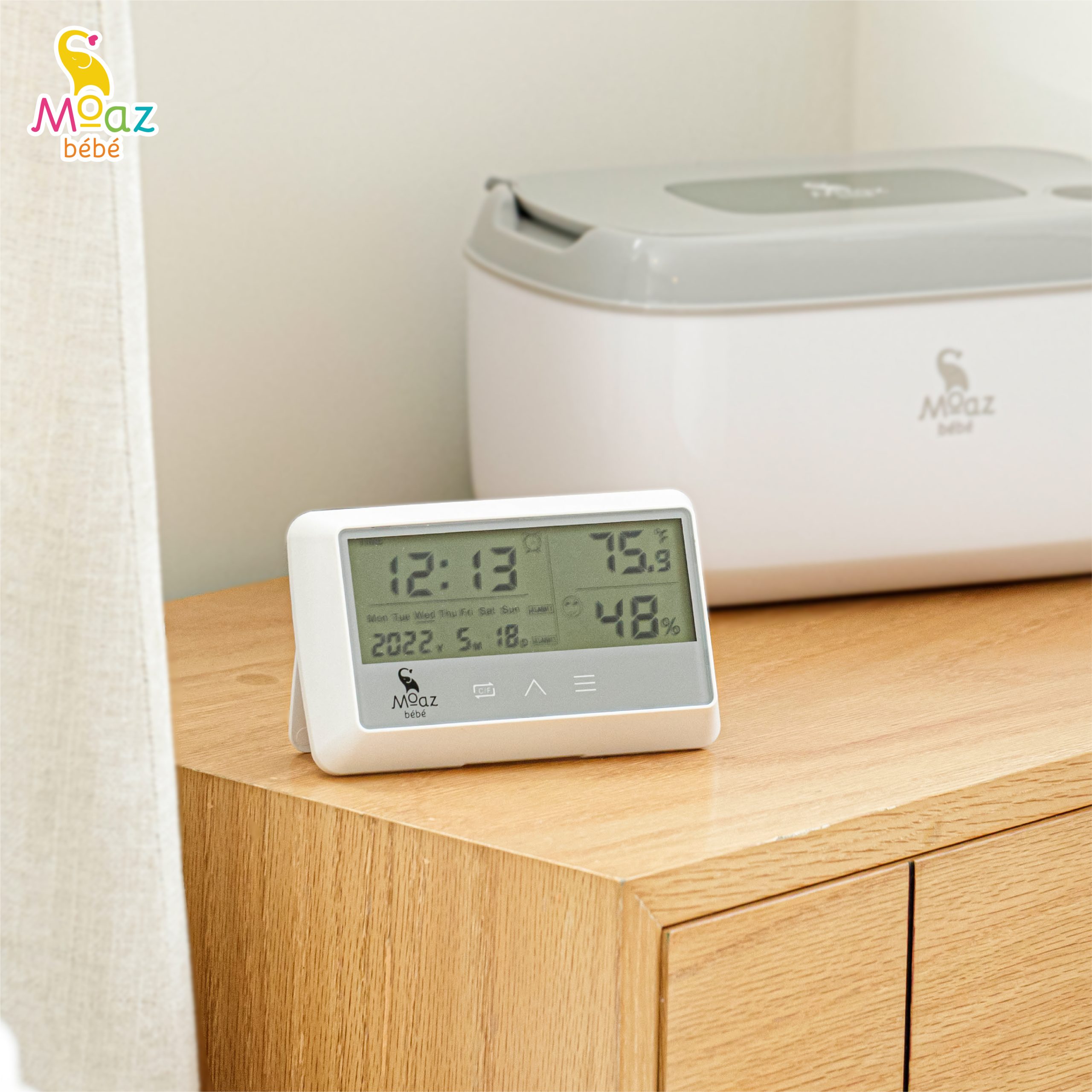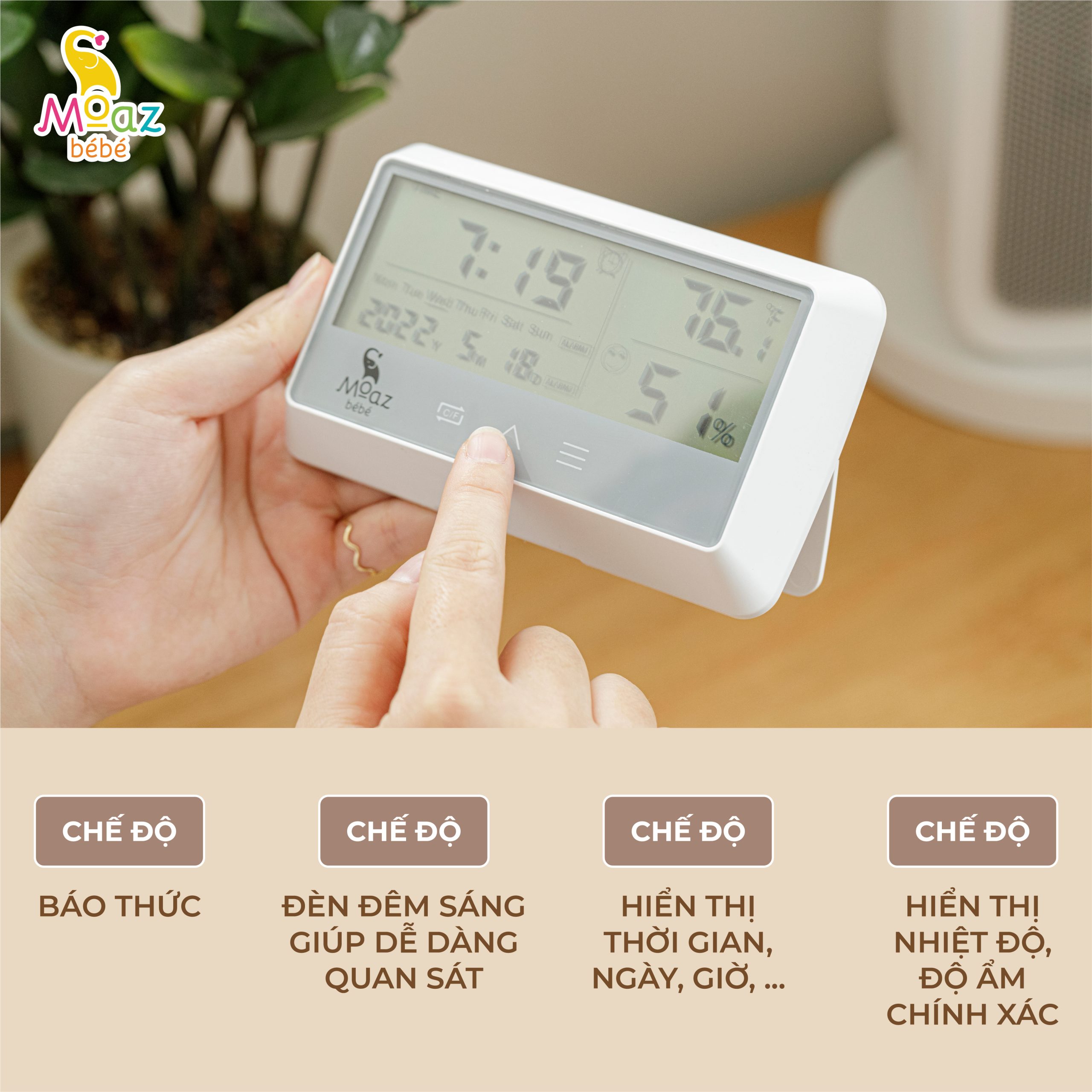 Sản phẩm nhỏ gọn tích hợp nhiều tính năng như: Đo nhiệt độ, độ ẩm, hiển thị thời gian và báo thức ở 3 khung giờ. Khả năng đo chính xác nhiệt độ, độ ẩm giúp mẹ có thể theo dõi và điều chỉnh phù nhiệt độ, độ ẩm thích hợp bảo vệ sức khỏe bé yêu.