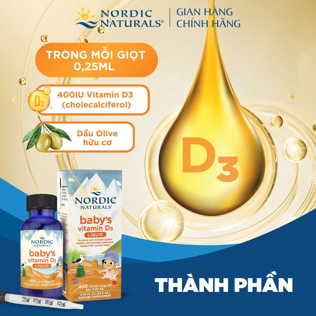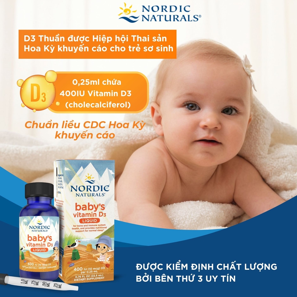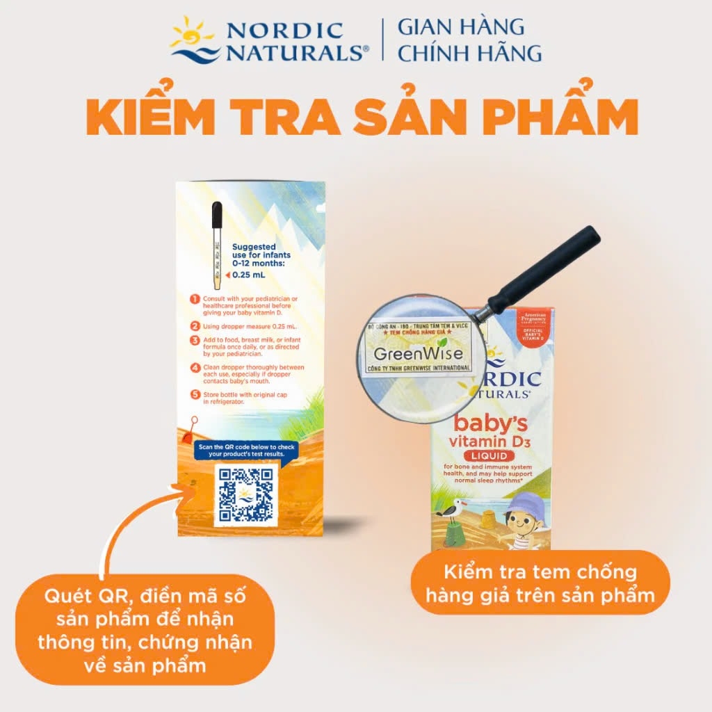 - Nordic Naturals Baby's Vitamin D3 được chứng nhận là sản phẩm vitamin D chính thức dành cho trẻ em của Hiệp hội Thai sản Hoa Kỳ. Thành phần của sản phẩm không chứa bất kỳ chất tạo màu, tạo vị hoặc chất bảo quản nhân tạo đảm bảo cung cấp cho trẻ từ sơ sinh loại vitamin D tinh khiết, an toàn và lành tính.