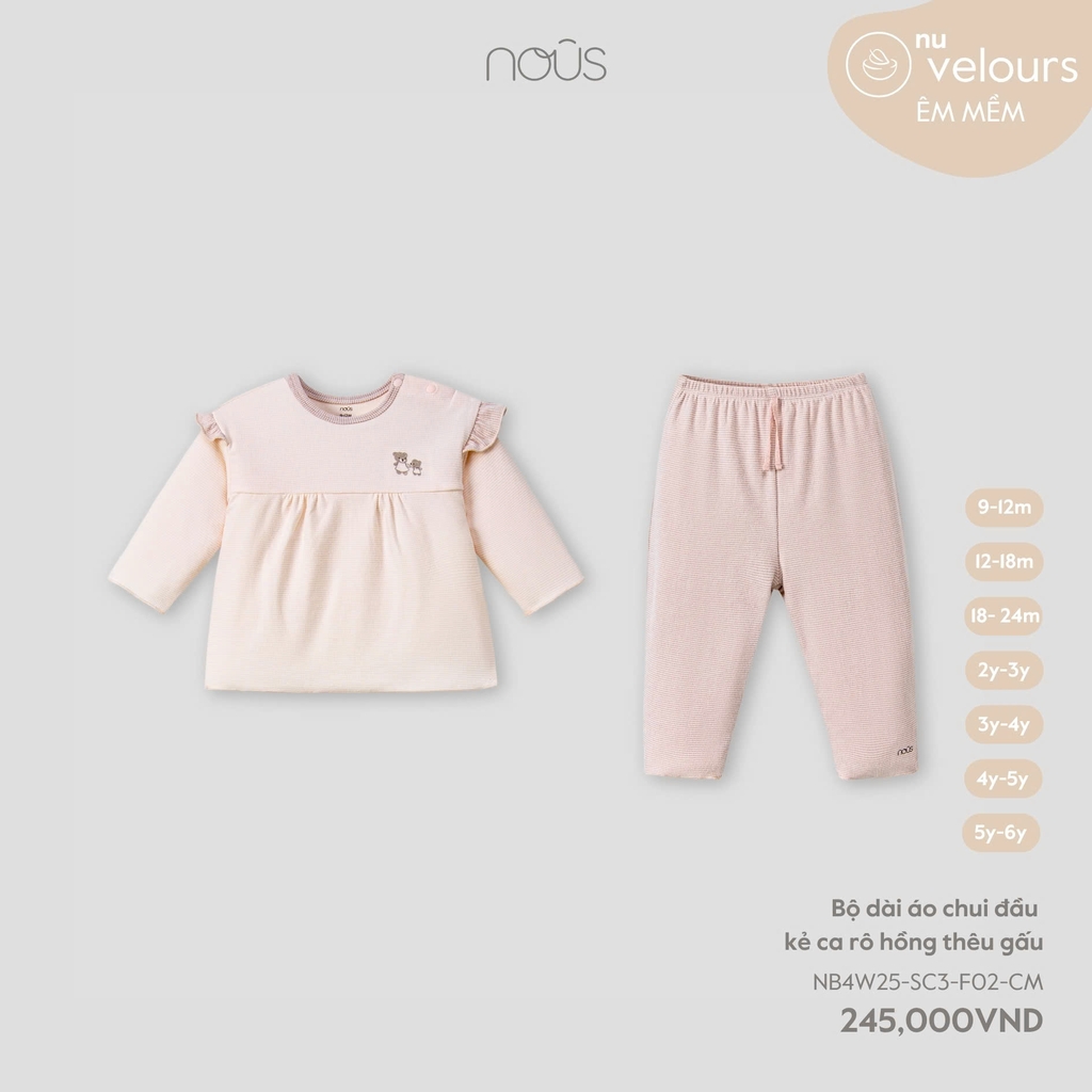 NOUS - Bộ dài áo chui đầu kẻ caro hồng thêu gấu(9M-6Y)