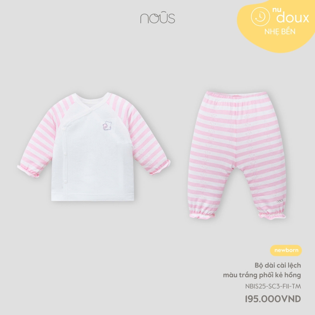 NOUS - Bộ dài cài lệch màu trắng phối kẻ hồng NB