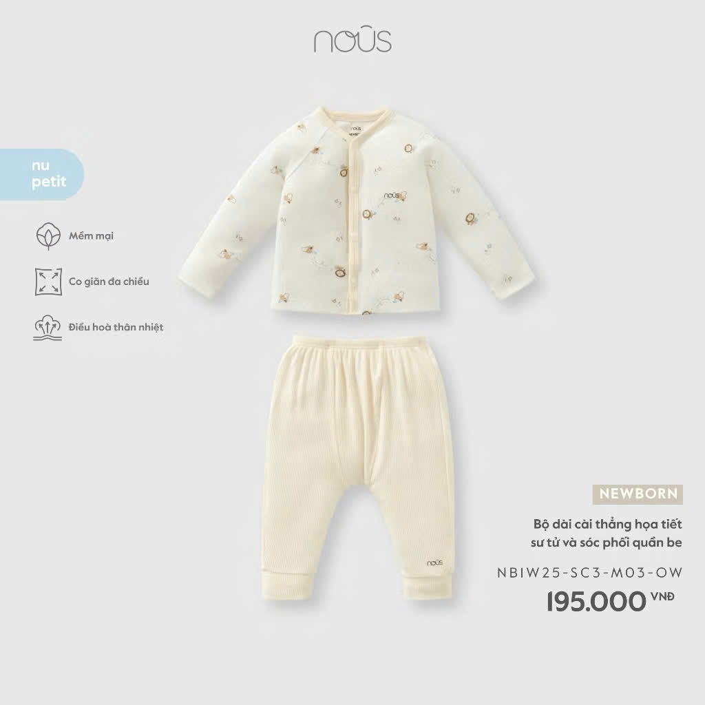 NOUS - Bộ dài cài thẳng họa tiết sư tử và sóc phối quần be NB