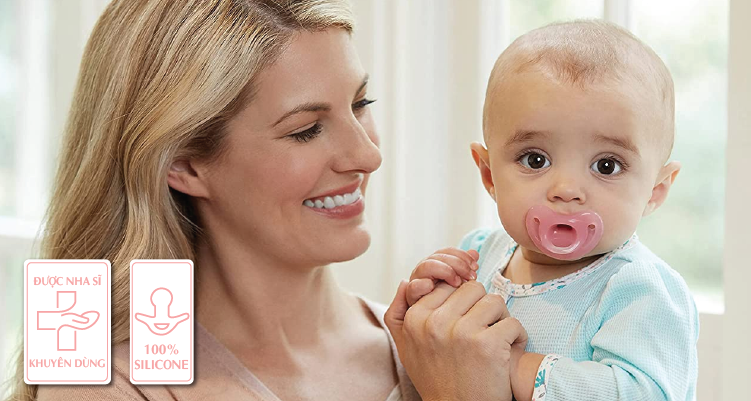 Ti giả NUK Sensitive 100% silicone thân thiện với làn da mỏng manh của trẻ sơ sinh, hạn chế tối đa áp lực lên hàm và răng của bé, hỗ trợ răng miệng phát triển lành mạnh theo khuyến nghị của Tổ chức Sức khỏe răng miệng Anh Quốc.