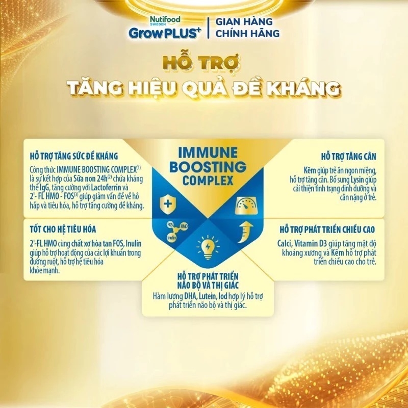 Công thức IMMUNE BOOSTING COMPLEX là sự kết hợp của Sữa non 24h chứa kháng thể IgG, tăng cường với Lactoferrin và 2'- FL HMO - FOS giúp giảm vấn đề về hô hấp và tiêu hóa, hỗ trợ tăng cường đề kháng.