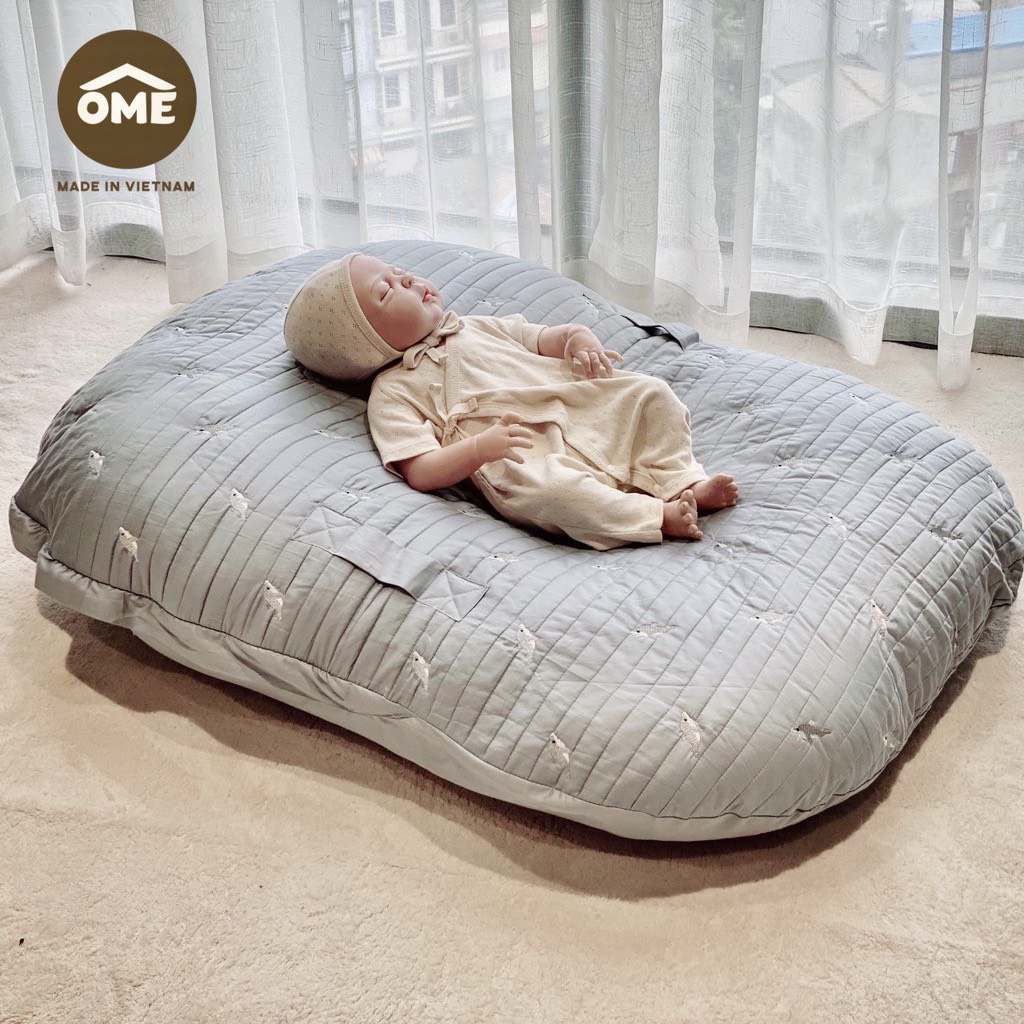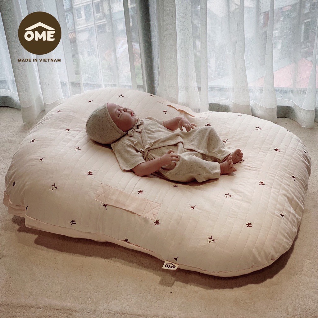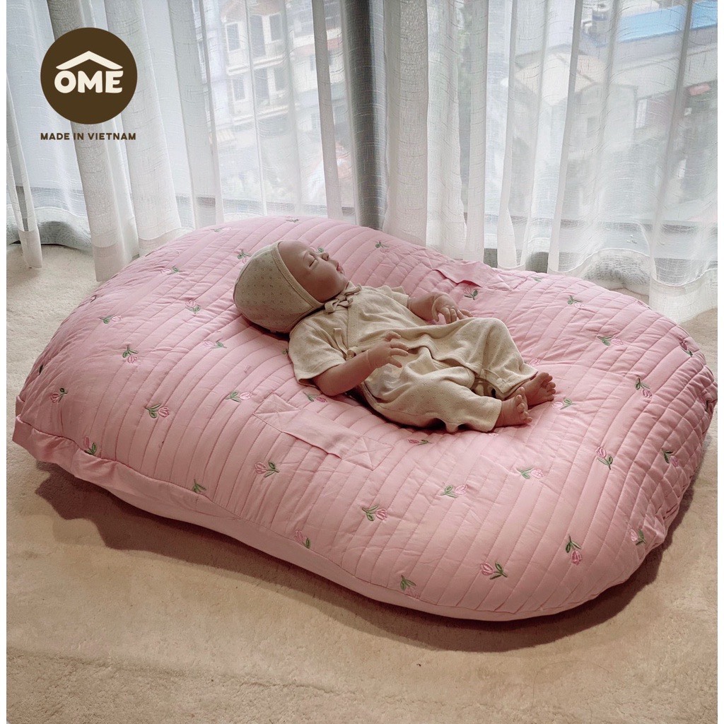 Vỏ gối là vải chần bông có rãnh thoáng khí thêu hình xinh xắn, ruột gối chống thấm, bông nhập khẩu Hàn Quốc có độ đàn hồi cao