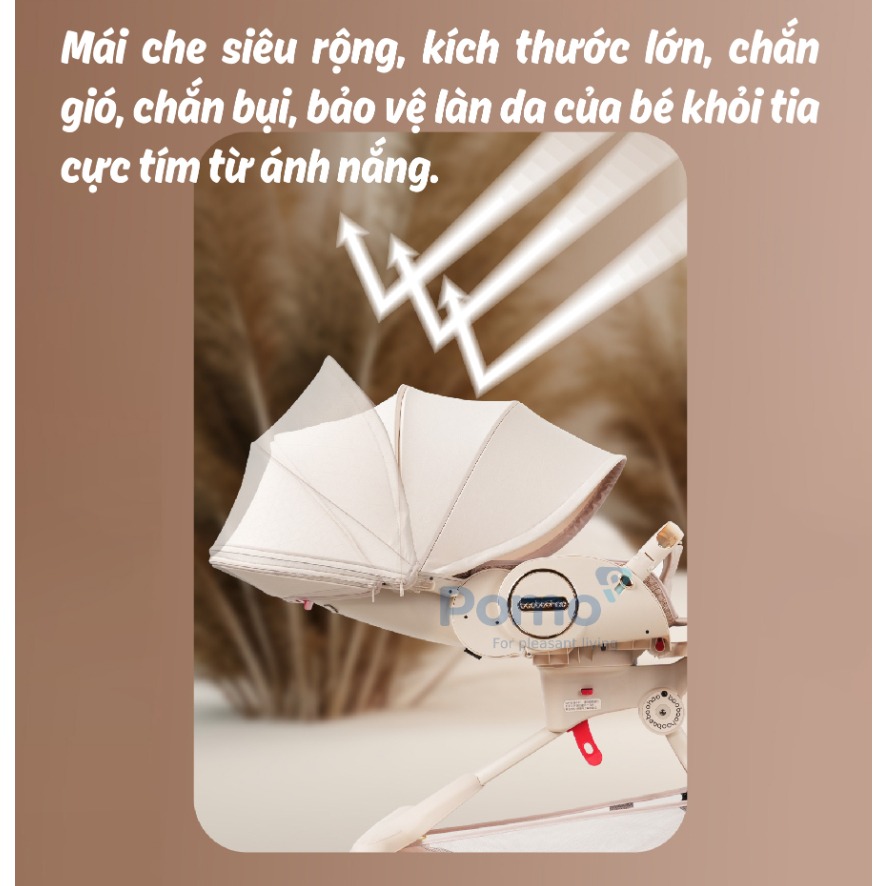 Mái che bằng vải cao cấp thoáng và rộng 4 mức, dễ dàng thu hẹp lại hoặc tháo rời khi không cần thiết.
